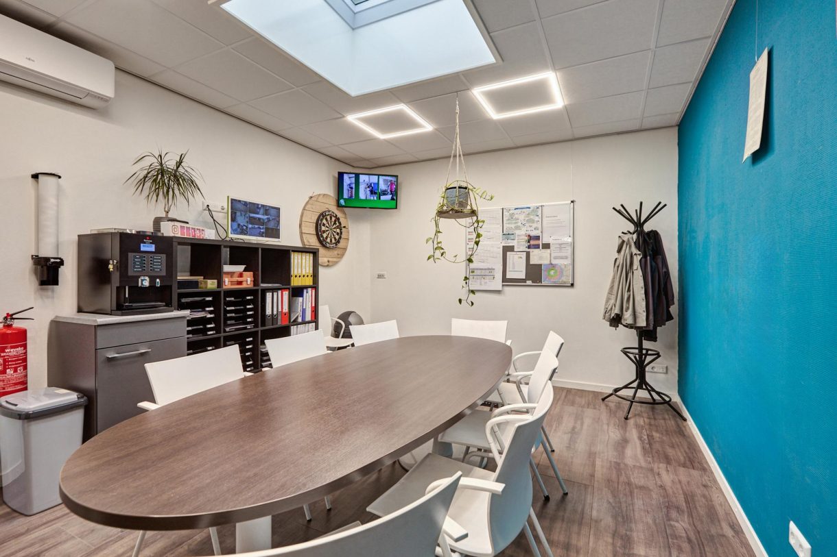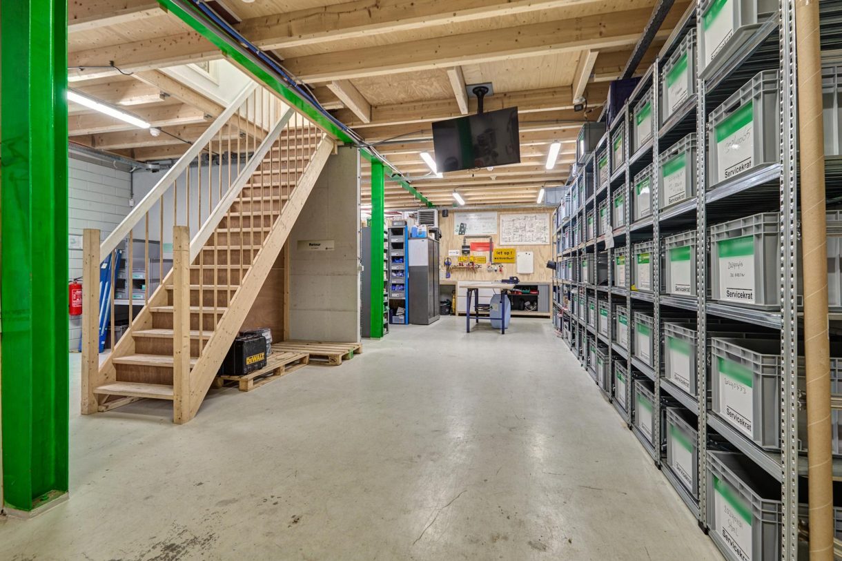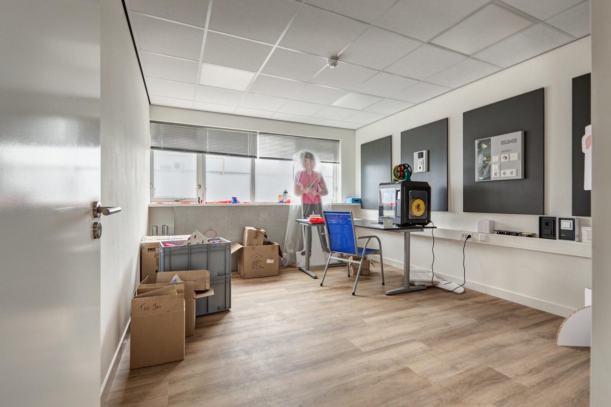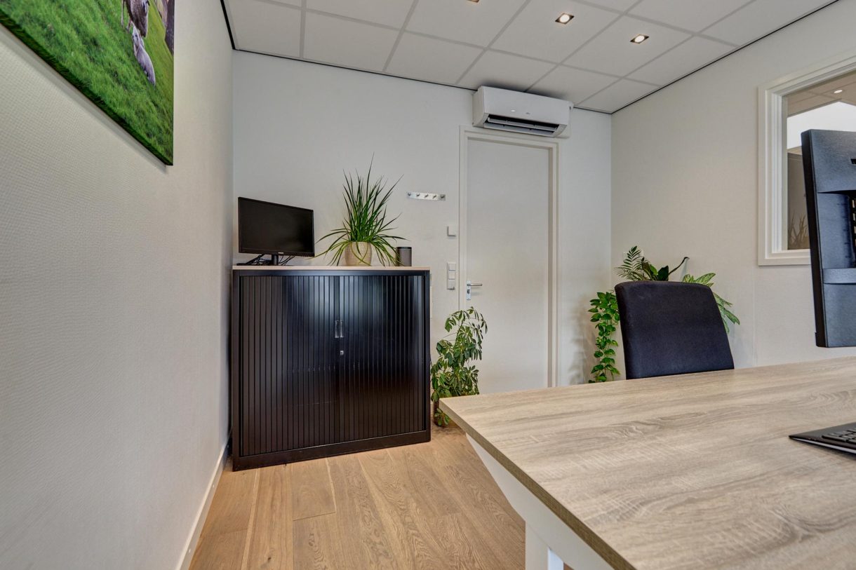 Op de etage bevinden zich de spreekkamer/directiekamer, de kantine, twee kantoren met diverse werkplekken en een archiefruimte. Door de aanwezige lichtkoepels, airconditioning en vloerverwarming zijn deze ruimtes uiterst aangenaam. In elke ruimte is bovendien gedacht aan UTP aansluitingen.