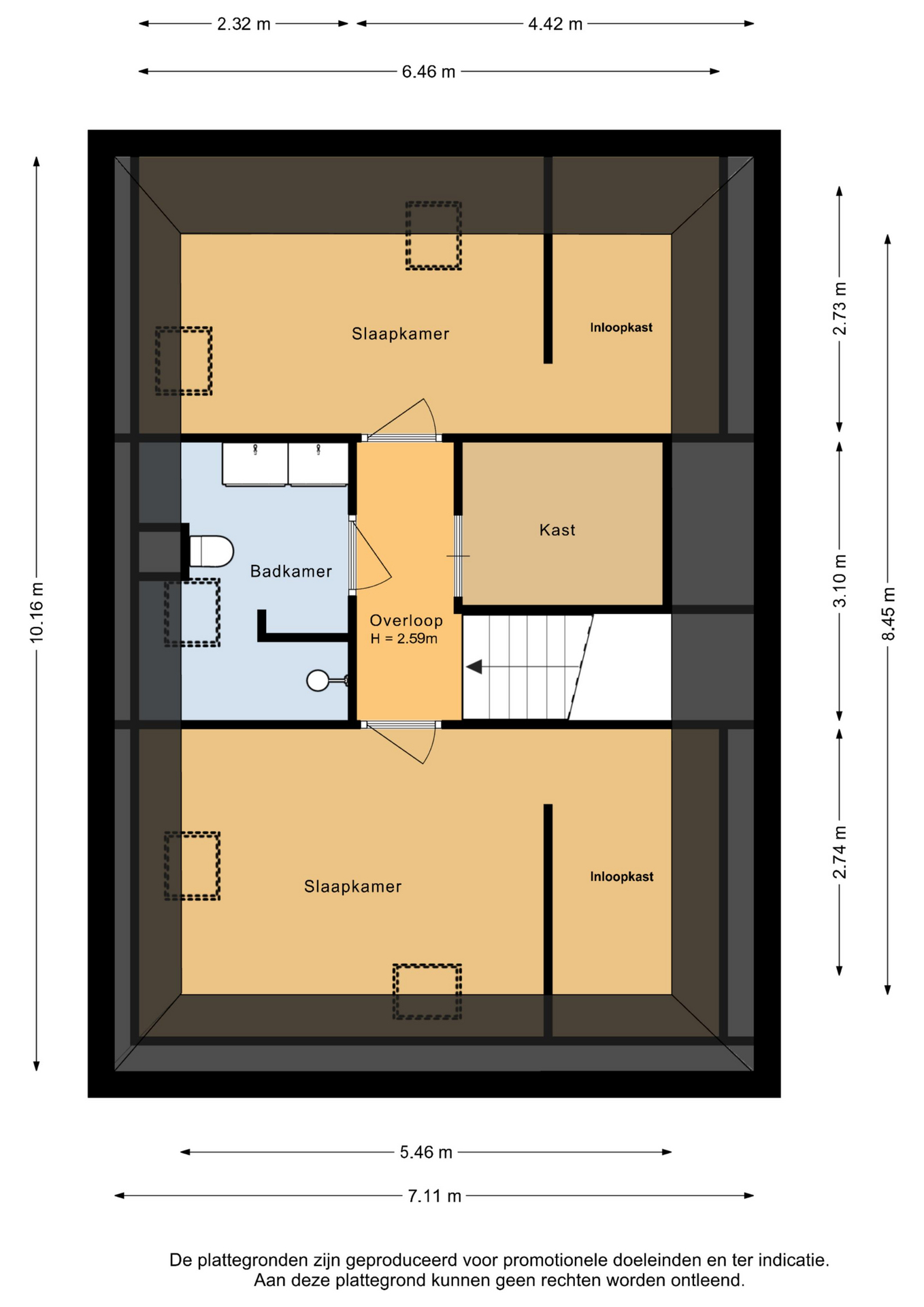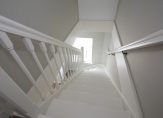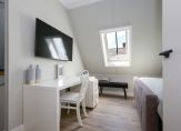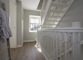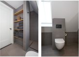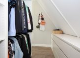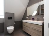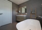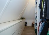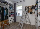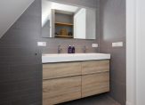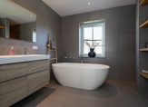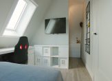 De tweede etage is al even indrukwekkend en kent een eigen badkamer met douche, toilet en dubbele wastafel. De twee slaapkamers op deze etage beschikken elk over een eigen inloopkast – een zeldzaam comfort – en op de overloop is bovendien nog een extra kast voor bergruimte aanwezig.