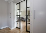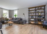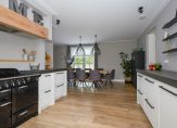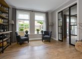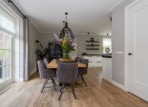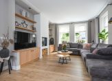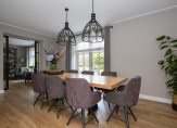 De woonkamer vormt het warme hart van het huis, voorzien van een open haard, stijlvolle raampartijen die het daglicht overvloedig binnenlaten, en op maat gemaakte inbouwkasten die de ruimte elegant aankleden. Via glazen schuifdeuren bereik je de aangrenzende eetkamer – een prachtige ruimte die zich opent naar de tuin via openslaande deuren, ideaal voor lange diners met zicht op het groen.
