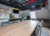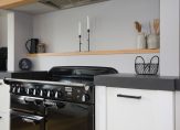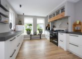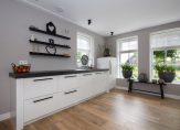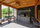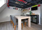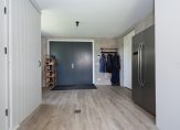 De open keuken is een culinair hoogtepunt, uitgerust met luxe inbouwapparatuur en smaakvol geïntegreerd in het woonconcept. Vanuit de keuken bereik je de inpandige garage, die met zorg is afgewerkt, inclusief een eigen toilet, praktische op maat gemaakte opbergkasten én een vaste trap naar de bovenverdieping – een stoere man-cave zoals je hem zelden ziet.