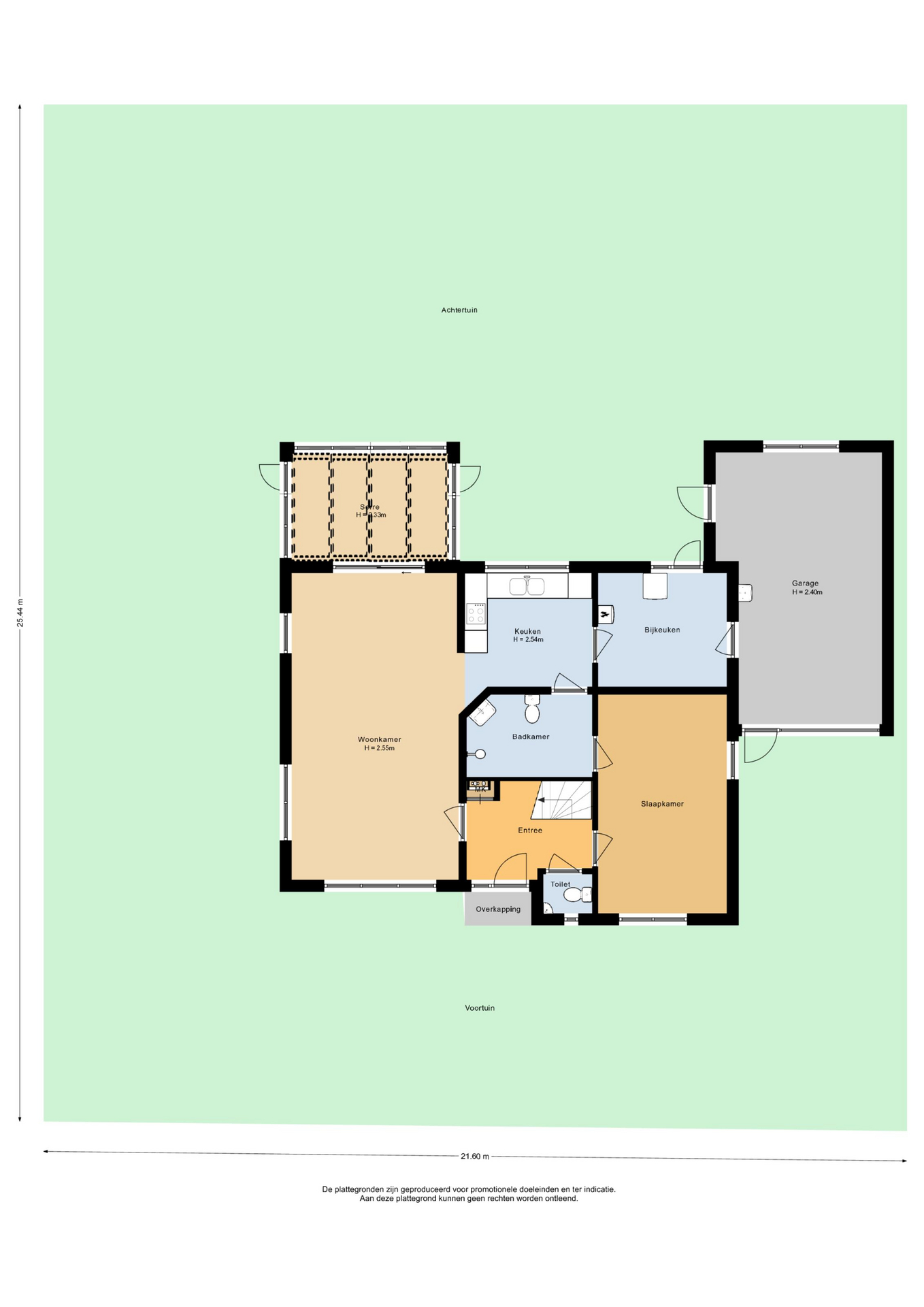 Hoewel de villa twee royale woonlagen heeft, is het mogelijk om de woning gelijksvloers te bewonen. De parterre is namelijk behoudens de grote woonkamer met tuinkamer, royale keuken, bijkeuken en garage voorzien van een slaapkamer c.q. kantoor en een badkamer.
