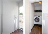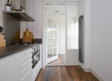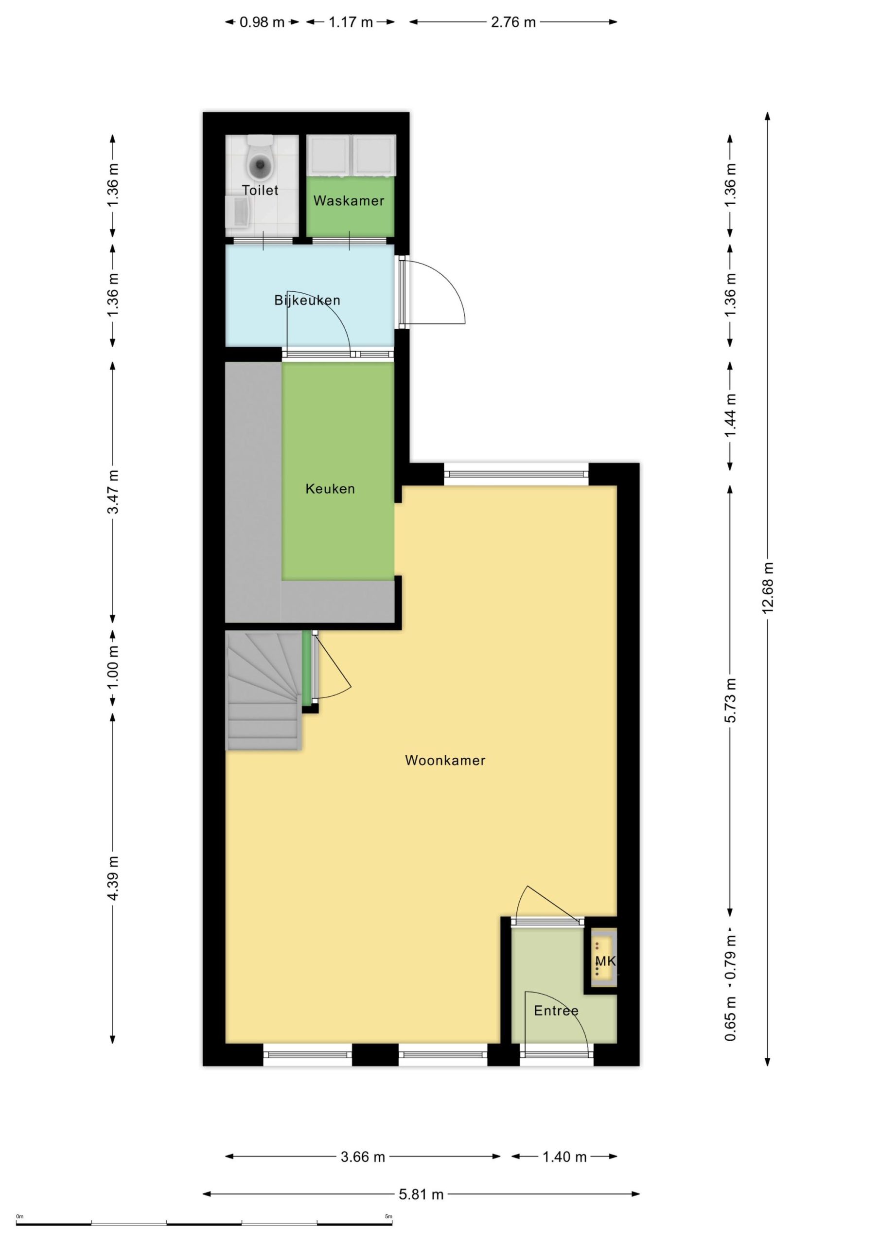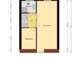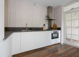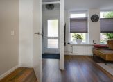 Bij binnenkomst tref je de hal met meterkast. Opvallend is dat het toilet zich niet in de hal bevindt, maar achterin de woning in de bijkeuken – praktisch en nét even anders! In de woonkamer vind je het woongedeelte aan de voorzijde, terwijl het eetgedeelte juist fijn aan de achterzijde ligt. De trap naar de eerste etage is slim af te sluiten met een deur, waardoor je de warmte lekker beneden houdt. Aansluitend aan de eetkamer ligt de halfopen keuken in een lichte kleurstelling, voorzien van diverse inbouwapparatuur. Vanuit de keuken loop je zo de bijkeuken in, waar het toilet en de wasruimte zich bevinden. Vanuit hier stap je de achtertuin in, die gunstig gelegen is op het zuidoosten. Extra fijn: je hebt hier geen inkijk van de achterburen, omdat de volgende rij woningen haaks staat op dit huis. De tuin beschikt daarnaast over een achterom en achterin vind je een stenen berging, ideaal voor het opbergen van fietsen en al je tuinspullen.