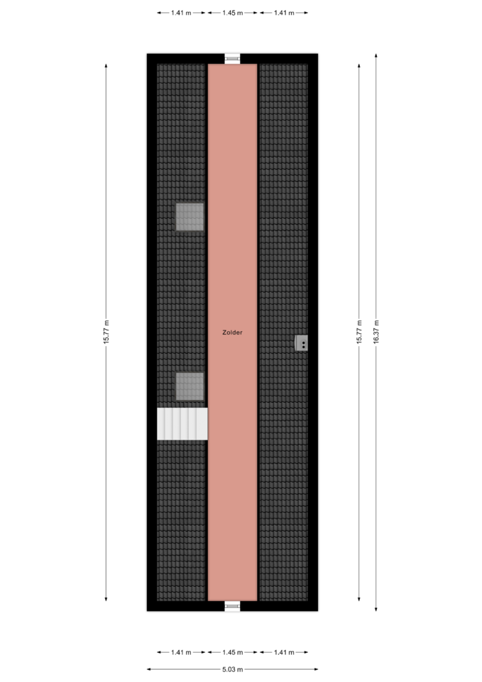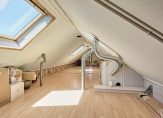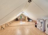 Met een vaste open trap bereiken we de tweede verdieping. Hier komt daglicht binnen via ramen aan zowel de voor- als achterzijde, alsook via twee Velux dakramen, waardoor de ruimte baadt in natuurlijk licht. Deze multifunctionele ruimte is voor vele doeleinden geschikt. Hier bevinden zich nu de aansluitingen voor het witgoed. Op de vloer ligt laminaat. De zolder is niet meegenomen in het aantal vierkante meters woonoppervlakte, wat betekent dat de woning nog eens 26 m² extra woongemak biedt.