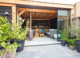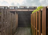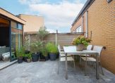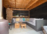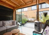 De zonnige achtertuin, vormt een serene buitenkamer, compleet met een overdekte veranda die met glazen panelen kan worden afgesloten. De houtkachel nodigt uit tot lange avonden vol warmte en sfeer, ongeacht het seizoen. Een geïntegreerde berging maakt deze buitenruimte niet alleen elegant, maar ook praktisch.