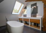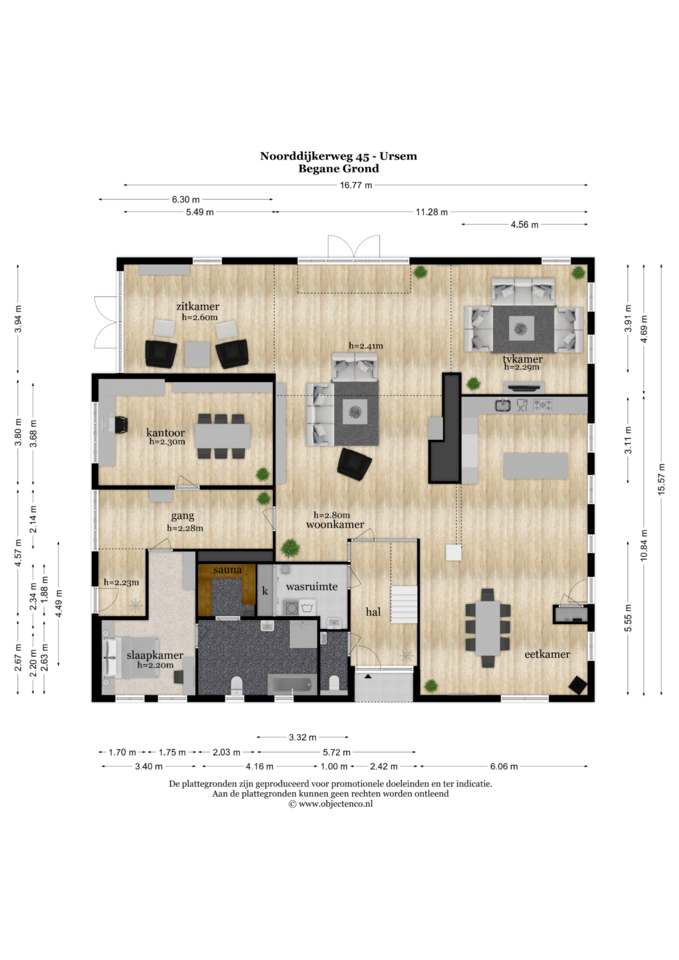 De woonkeuken vormt het hart van het huis en wordt verwarmd door een sfeervolle pelletkachel. Een aparte hal aan de achterzijde verbindt de woning met onder meer een kantoorruimte (of extra slaapkamer), een luxe slaapkamer met en-suite badkamer en sauna, een toilet en een praktische wasruimte.