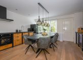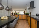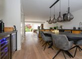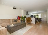 Bij binnenkomst kom je in de hal, voorzien van het toilet en een binnendoor naar de berging. Via de deur aan de rechterzijde betreed je de ruime open keuken, uitgerust met diverse hoogwaardige inbouwapparatuur, waaronder een SMEG koelkast, een SMEG inductiekookplaat en niet één, niet twee, maar drie wijnklimaatkasten (ter overname) – ideaal voor de echte wijnliefhebber. Het eetgedeelte bevindt zich te midden van de keuken, zodat koken en tafelen naadloos in elkaar overlopen. Het woongedeelte ligt aan de achterzijde van de woning, is uitgebouwd en voorzien van sfeervolle inbouwspots. Hier vind je een home cinema met beamer en uitrolbaar scherm (ter overname), perfect voor filmavonden of sportwedstrijden kijken in stijl. De openslaande deuren geven toegang tot de diepe achtertuin op het zuidwesten, met extra perceel eigen grond en een luxe overkapping met sfeervolle verlichting, ideaal om te loungen, barbecueën of gewoon te genieten van het buitenleven.